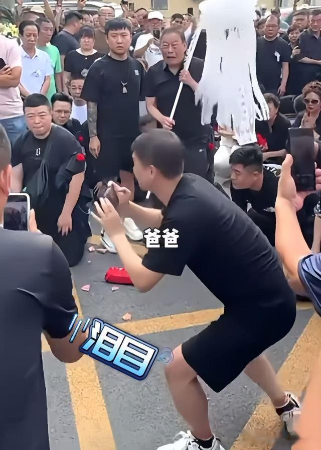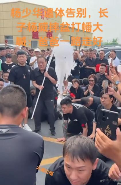在外面为杨少华摔盆扛帆,对着父亲的棺材悲痛欲绝,叫了一声爸爸之后,哭得像是个孩子,腿都站不稳了,还得让旁边的两个人搀着。